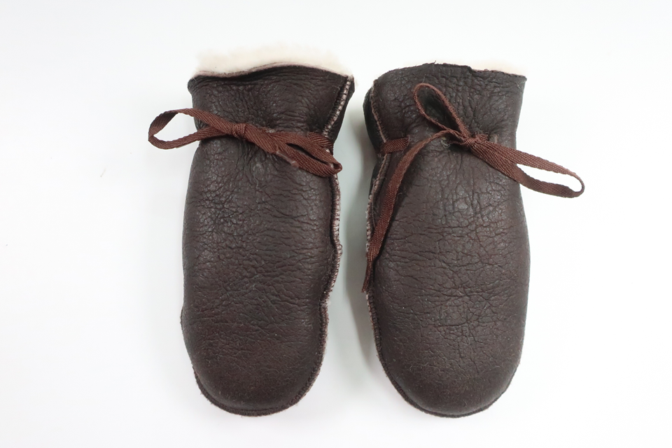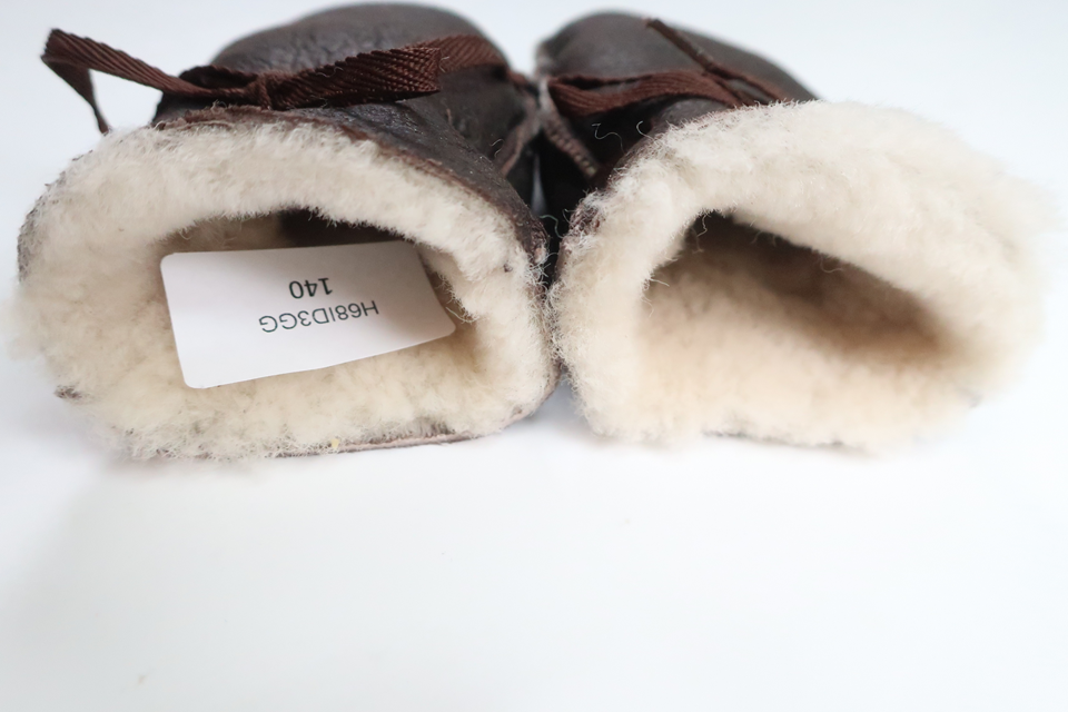 Storleken saknas och bedöms motsvara storlek 1-3 år. Material saknas men känns som äkta ull och skinn. Nyskick