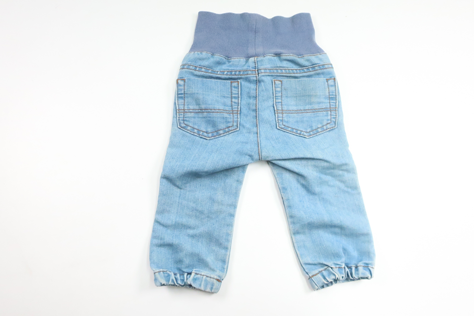 Storleken saknas och bedöms motsvara storlek 74. Midjan är lite blekt och det finns två missfärgningar, annars i fint skick